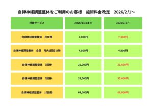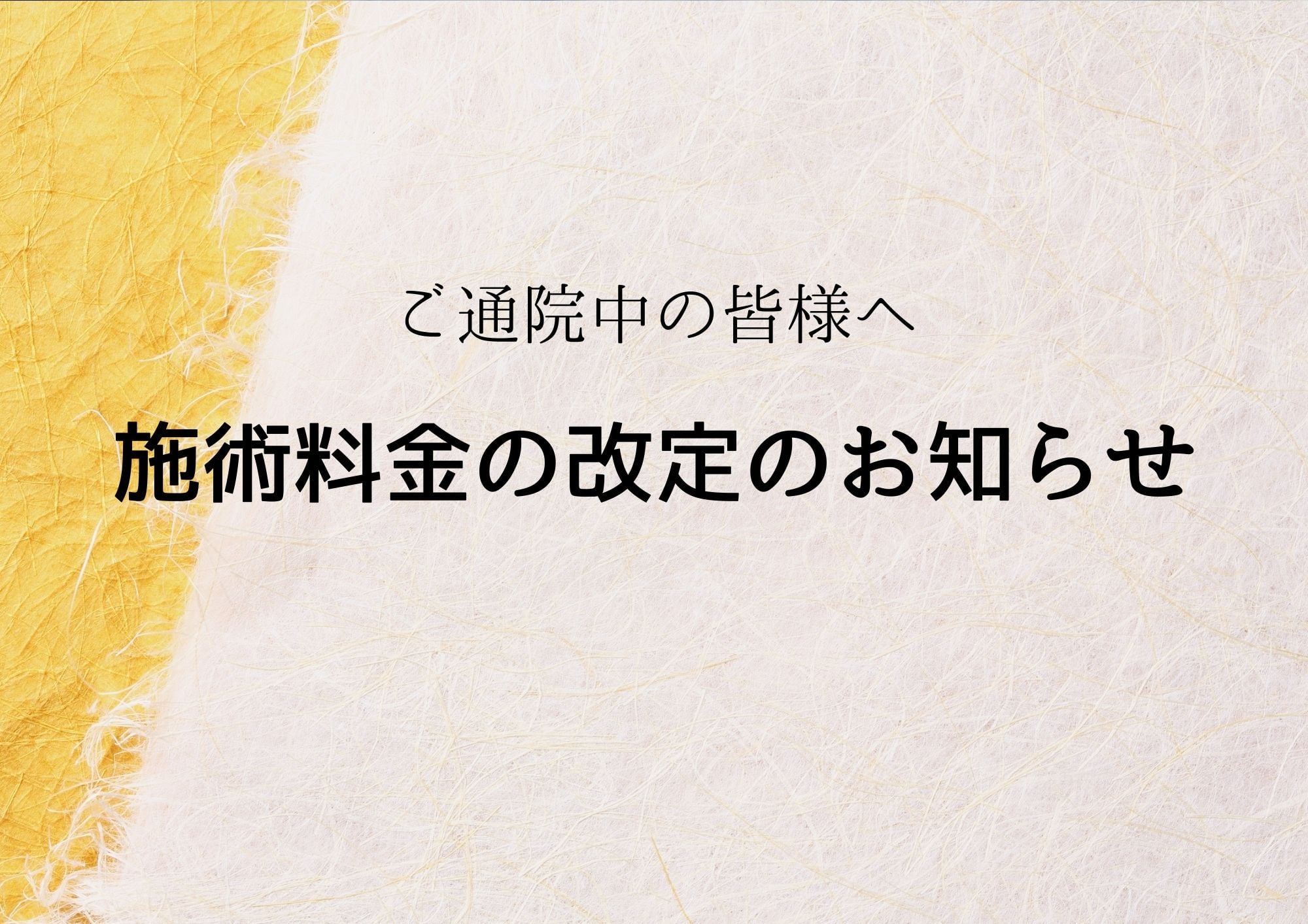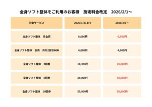 さてこの度、大変心苦しいお知らせではございますが、2026年2月1日より、施術料金の価格改定をさせて頂くこととなりました。