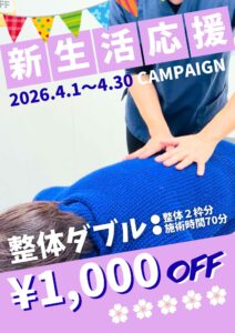 整体ダブル[整体2枠分の70分]を1000円引きでご提供! ※4月末まで
