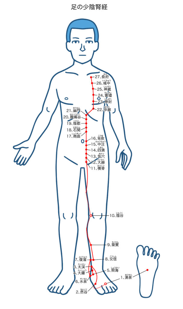 さらに東洋医学では、「腎」が水(=体液)のめぐりを司るとされ、その経絡(腎経)は足の裏から始まり、内くるぶし・ふくらはぎ・太ももを通って体幹へとつながっています。