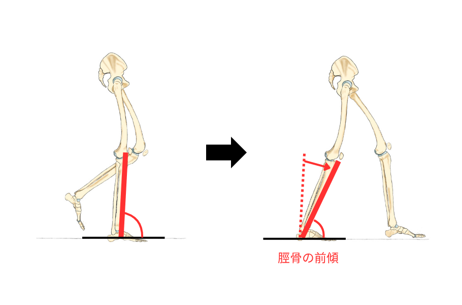 体が前へ進むにつれて脛骨(すねの骨)が前に倒れ(前傾)ることで、自然と足首が曲がる(背屈する)動きが起こります。