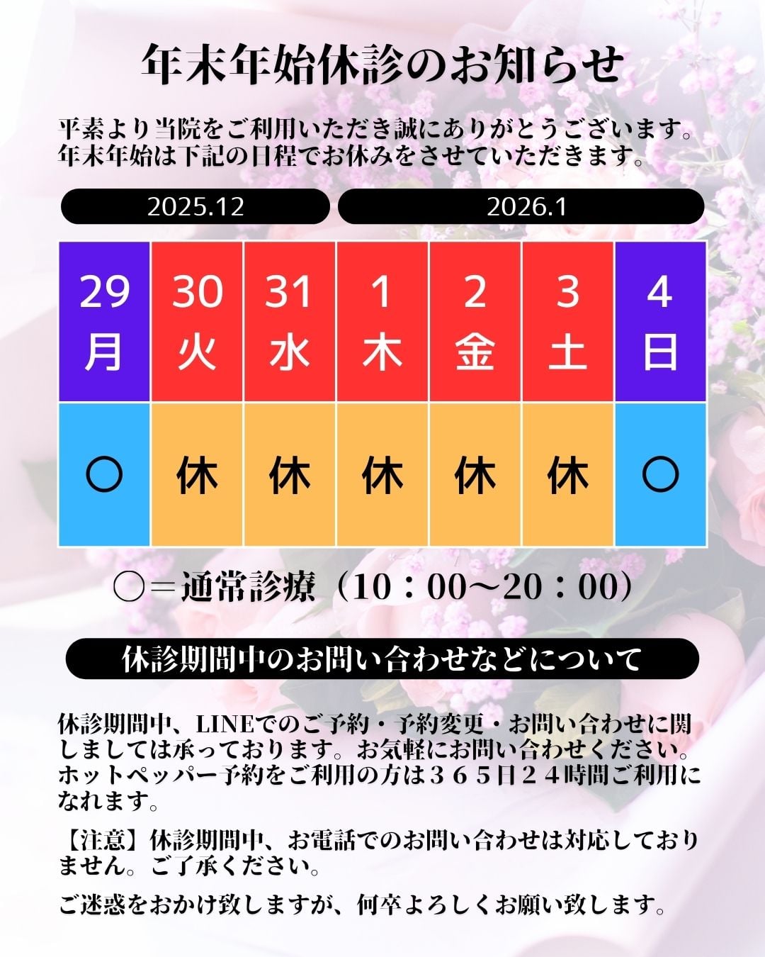 年末年始は下記の日程でお休みをさせていただきます。ご不便おかけ致しますが、何卒よろしくお願い致します。